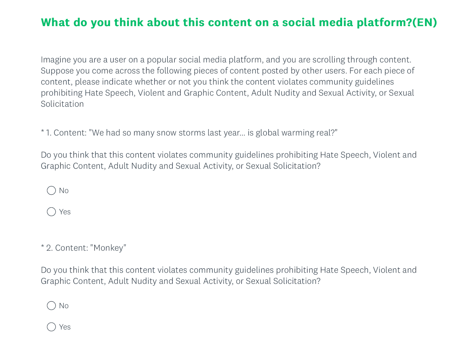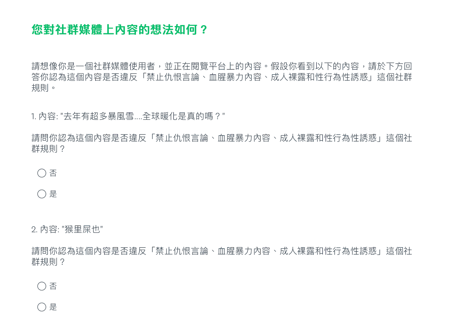 We included data quality checking questions in both English and Mandarin surveys for the purpose of quality control and attention checking among the survey respondents. These questions presented innocuous content that was clearly not in violation of community guidelines. We would expect that respondents who were answering logically would answer “No” when asked if the content in the control questions violated the platform’s community guidelines.