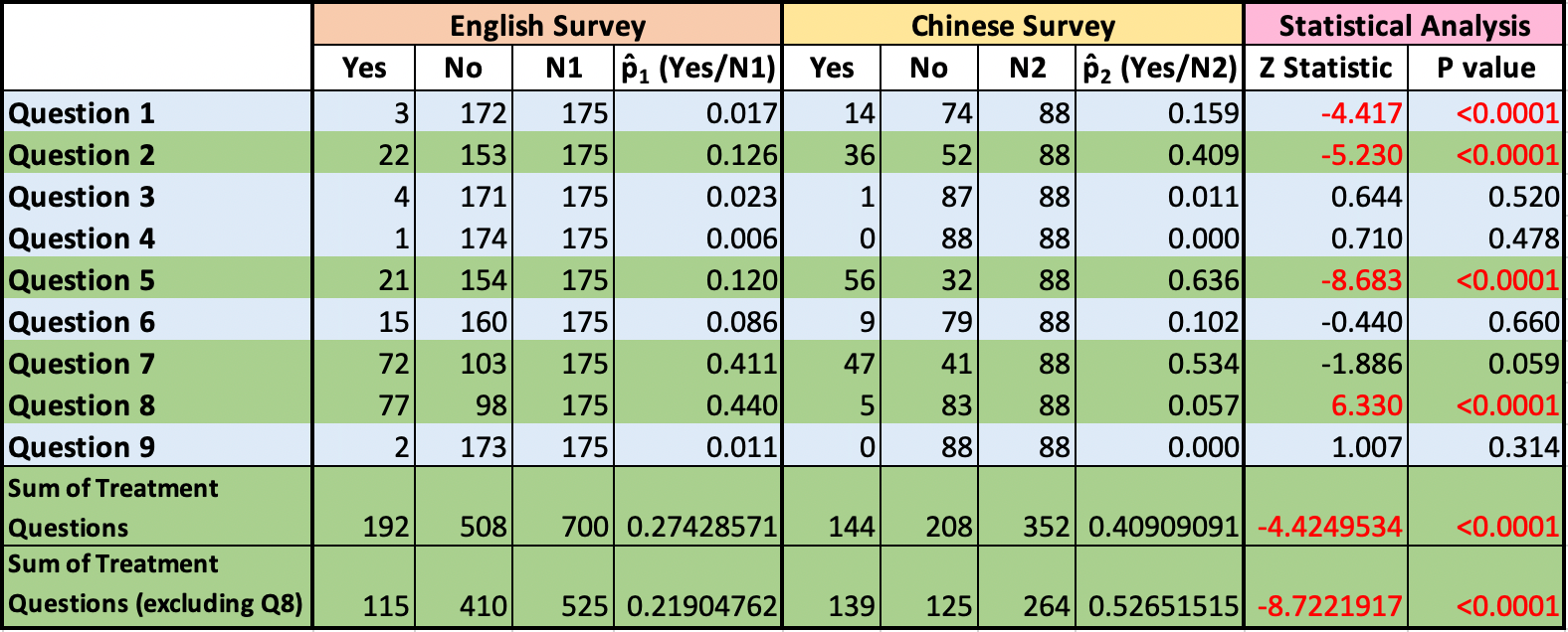 Next, we compared the aggregated results of each survey. We summed the numbers of “Yes” and “No” responses across all treatment questions (Questions 2, 5, 7, and 8), which produced the result shown in the “Sum of Treatment Questions” row of Figure 4. We then conducted a Z-test that tested the difference between Mandarin and English results for the sum of the treatment questions. In other words, we tested whether the proportion of "Yes" responses across all treatment questions in the English Survey was equal to the proportion of "Yes" responses across all treatment questions in the Mandarin Survey.