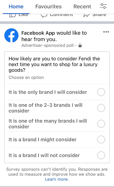 Figure 5. Facebook’s existing public survey function could be the vehicle (Facebook would gather user feedback on content using this feature)