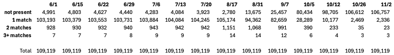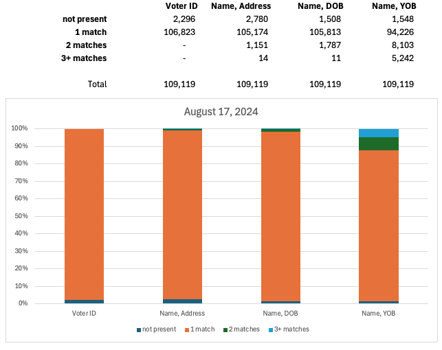 In the June 1 observation of Voter Data, 105,833 voterIDs for DroppedSubejcts were uniquely present. The remaining 3,386 voterIDs were not found in the June 1 snapshot because they were registered later and subsequently removed. The first data column in Figure 6 reports this information with “not present” representing voterIDs of DroppedSubjects that were not found in the Voter Data at the time of observation and “1-match” counting the number of DroppedSubjects whose voterID uniquely appeared in the data.