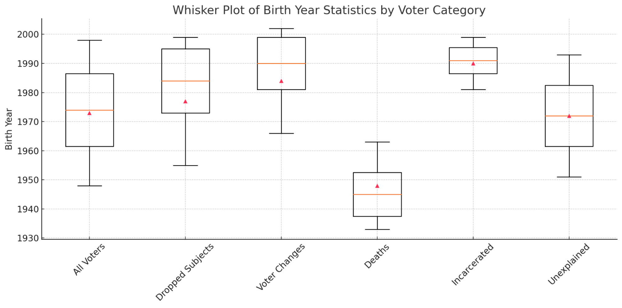 Figure 14 visualizes the median, mean, and standard deviation of birth years for the six voter categories presented in Figure 13. Each box approximates the interquartile range using half a standard deviation; the horizontal line marks the median, and the triangle denotes the mean. The plot shows that voters removed due to death were the oldest group, while those removed due to incarceration were among the youngest and had the narrowest age range. Overall, DroppedSubjects skewed younger than the full voter population and those with Unexplained removals. Among the DroppedSubjects categories—Voter Changes, Deaths, Incarcerated, and Unexplained—the age distribution of the Unexplained group most closely resembled that of all registered voters.