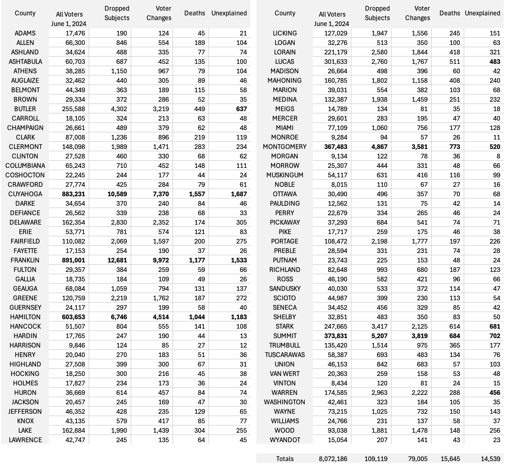 Figure 15. Total voter registrations, DroppedSubjects, and reasons for removal by Ohio county, revealing both population-driven patterns and disproportionate unexplained removals in several counties. Bold shows largest numbers in each column.