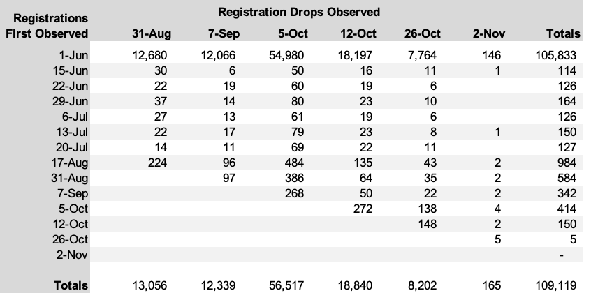 - October 26 – November 2: 165 registrations dropped