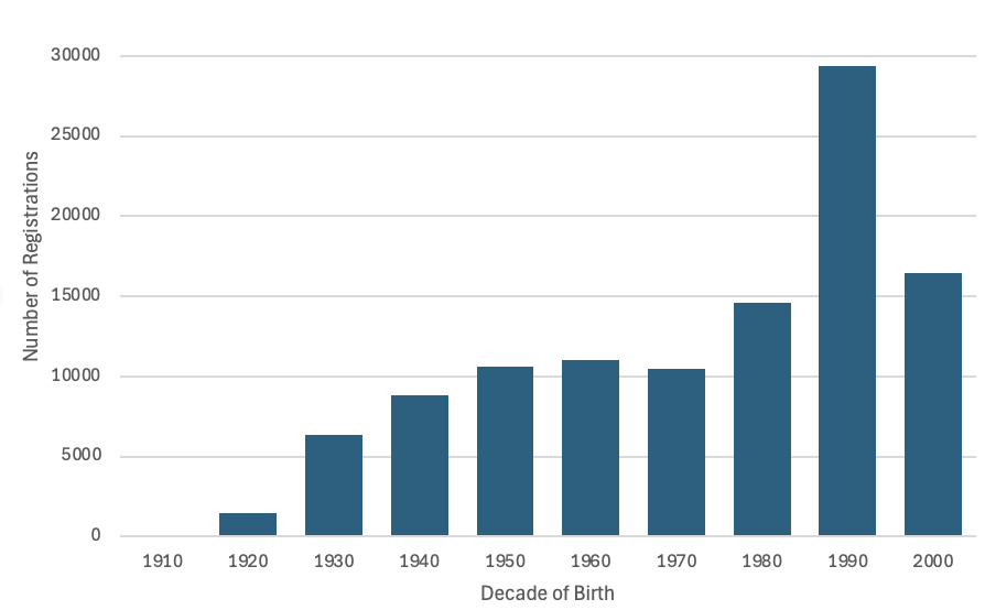 The ages of individuals in DroppedSubjects vary widely, with birth years ranging from 1917 to 2008. The average birth year is 1977, corresponding to an average age of 47, with a standard deviation of 22 years. The median birth year is 1984, representing a typical age of 40. Figure 4 provides a visual representation of the distribution of DroppedSubjects by decade of birth. Registrations for individuals born in the 1990s, corresponding to the tallest bar in Figure 4 total 29,351, accounting for 27 percent of all DroppedSubjects. This age group represents voters aged 25 to 34.
