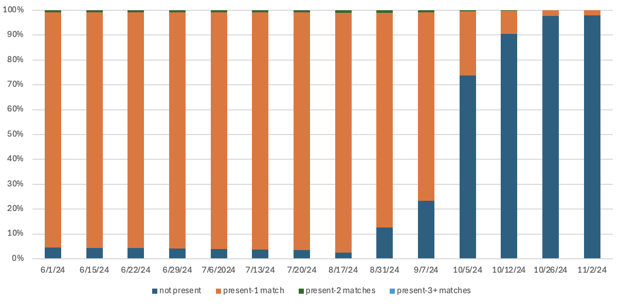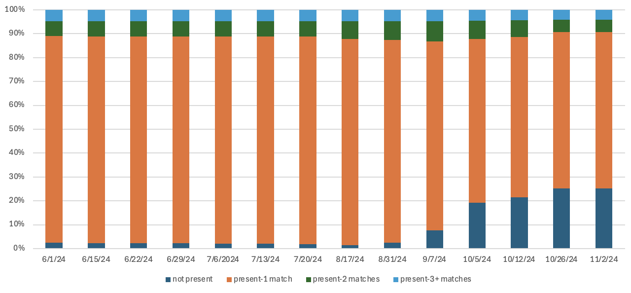 Figure 8. Distribution of registrations associated with DroppedSubjects by name and full date of birth over time in 2024. (a) Numerical breakdown and (b) graphical representation of the occurrences of registrations with the same name and month, day, and year of birth as DroppedSubjects in data snapshots between June 1 and November 2, 2024. For each observation, registrations are categorized as: “not present” for those not found in the Voter Data; “1 match” for registrations with exactly one record matching the name and date of birth; “2 matches” for cases with two matching records; and “3+ matches” for instances where more than two registrations appeared for the same name and date of birth.