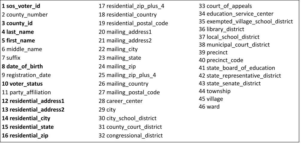 Figure 1. Fields in the Ohio Voter Data August through November 2024. Fields used in this study appear in bold.