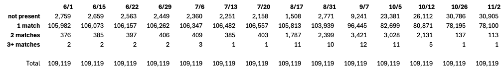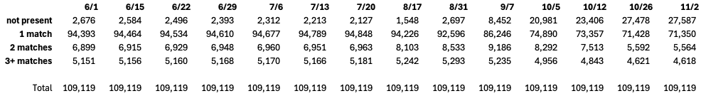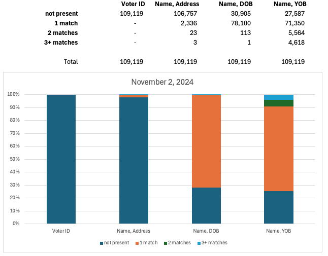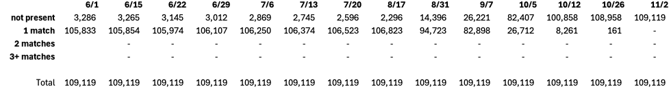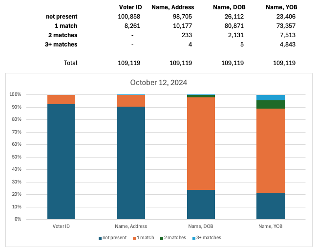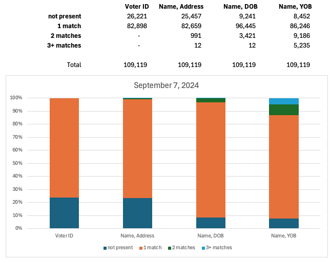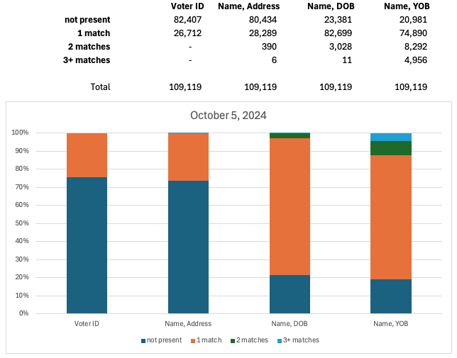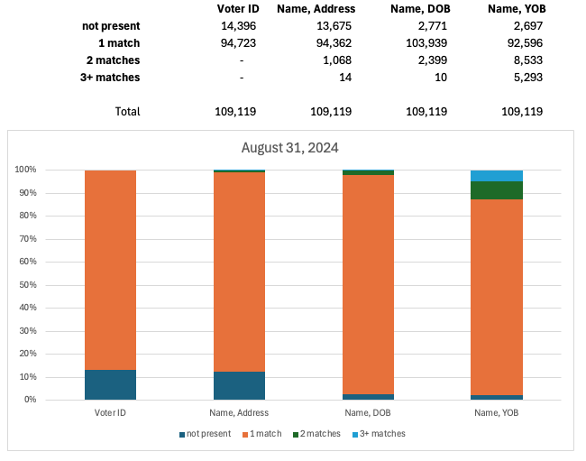 In the June 1 observation of Voter Data, 105,833 voterIDs for DroppedSubejcts were uniquely present. The remaining 3,386 voterIDs were not found in the June 1 snapshot because they were registered later and subsequently removed. The first data column in Figure 6 reports this information with “not present” representing voterIDs of DroppedSubjects that were not found in the Voter Data at the time of observation and “1-match” counting the number of DroppedSubjects whose voterID uniquely appeared in the data.