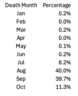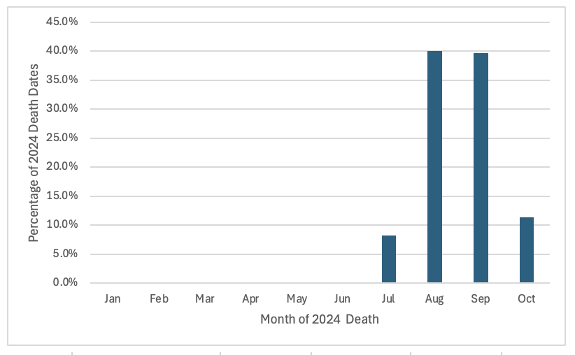 Figure 11. Distribution of month of death among voter registrations for those DroppedSubjects confirmed as deceased. Death updates during the Last 66 Days were primarily for deaths in August and September 2024.