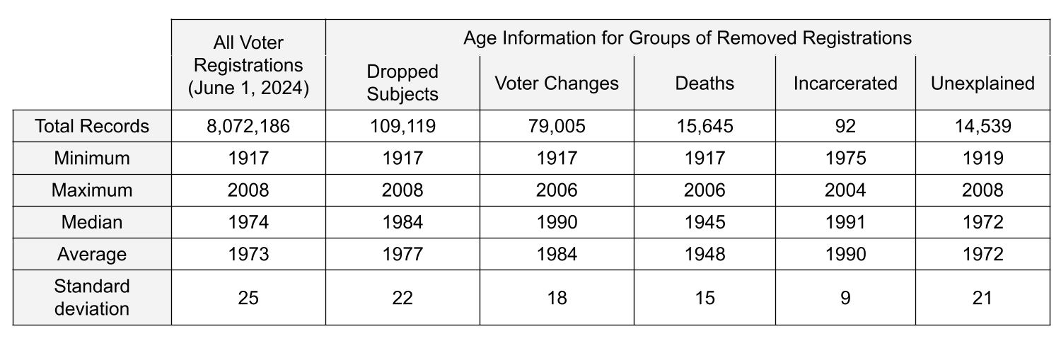Figure 13 presents summary statistics on the ages of voters whose registrations were removed from Ohio’s voter roll in the lead-up to the 2024 general election, based on a snapshot of all 8,072,186 registrations as of June 1, 2024 and five key groups: all Dropped Subjects (109,119 total) and four subgroups categorized by the reason for removal—Voter Changes, Deaths, Incarcerated, and Unexplained. Each group is described by the earliest and latest birth years, as well as the median, average, and standard deviation of birth years in order to approximate age distributions.