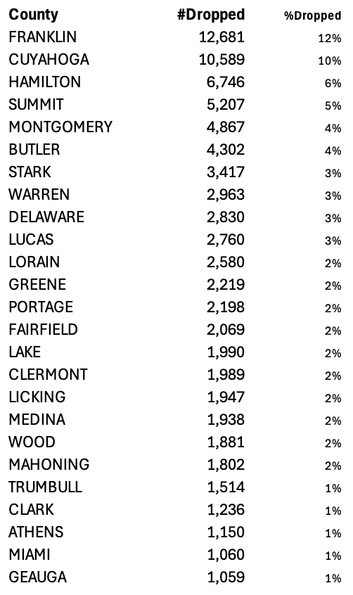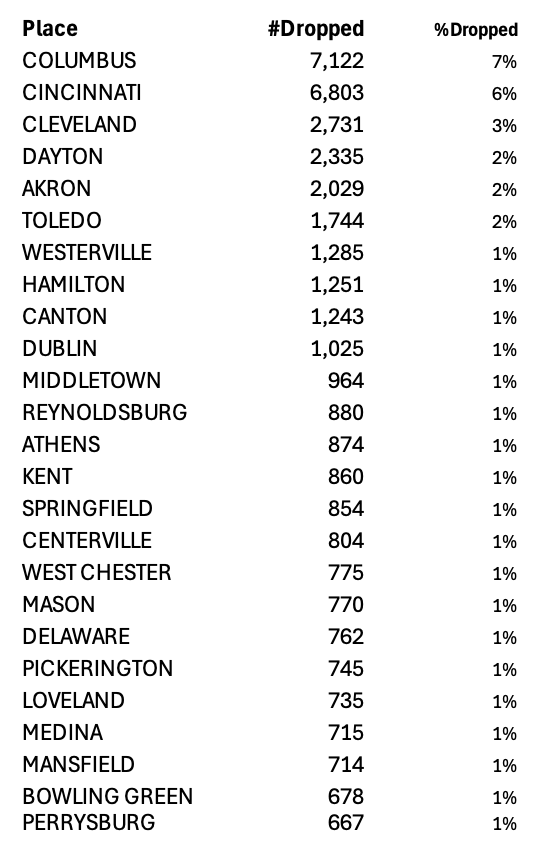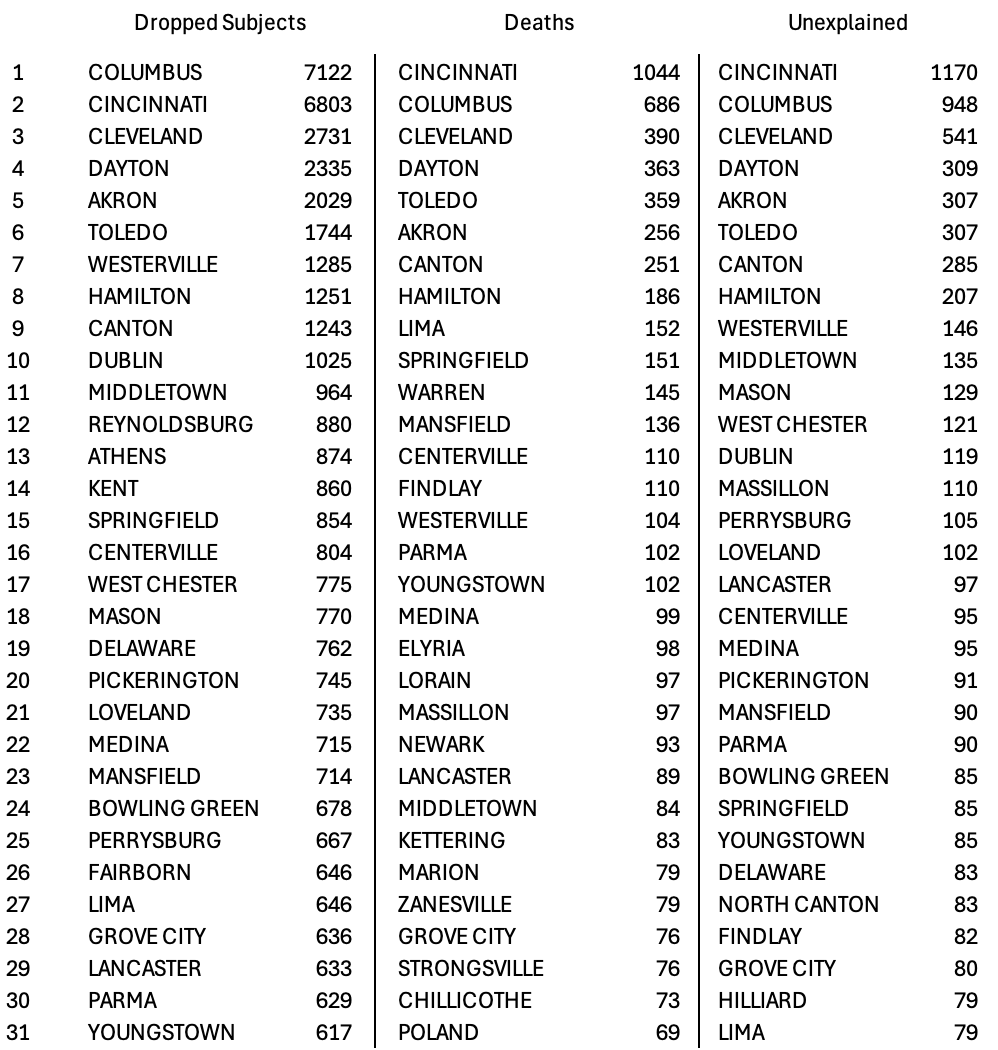 The registrations associated with DroppedSubjects span 1,043 places across Ohio. Figure 5 highlights the 25 places and counties with the highest counts. In 2024, Ohio’s largest cities by population are Columbus (913,175), Cleveland (362,656), Cincinnati (311,097), Toledo (265,304), Akron (188,701), and Dayton (135,512) [27], which also rank among the highest in the number of DroppedSubjects. Columbus leads with 7,122 DroppedSubjects—roughly 7 percent of all DroppedSubjects.