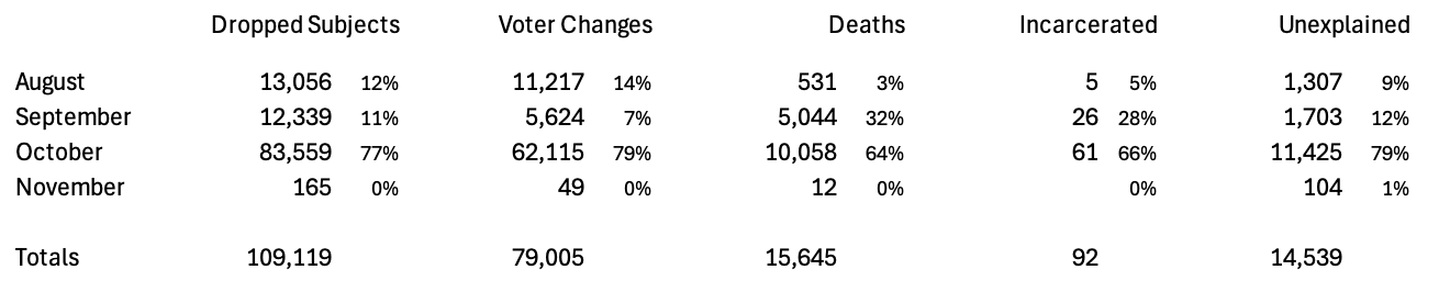 Figure 12. Accounting of reasons for the voter registrations of DroppedSubjects being removed in the last days before the Election.