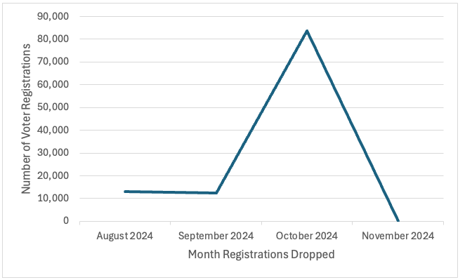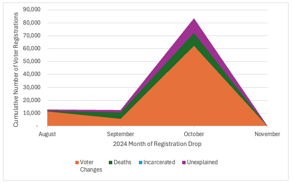 Most voter registration removals occurred in October, regardless of the reason for removal—including among those that remain unexplained. Figure 17 illustrates the temporal distribution of dropped records, broken down by category of removal, highlighting a clear concentration of activity one month before Election Day.