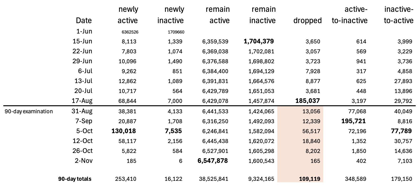 Figure 2. Counts of Ohio voter registration status changes over time, as shown by data snapshots taken between June 1 and November 2, 2024. The largest value in each column appears in bold. The highlighted area shows a total of 109,119 voter registrations dropped during the Last 66 Days.
