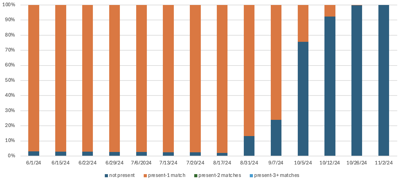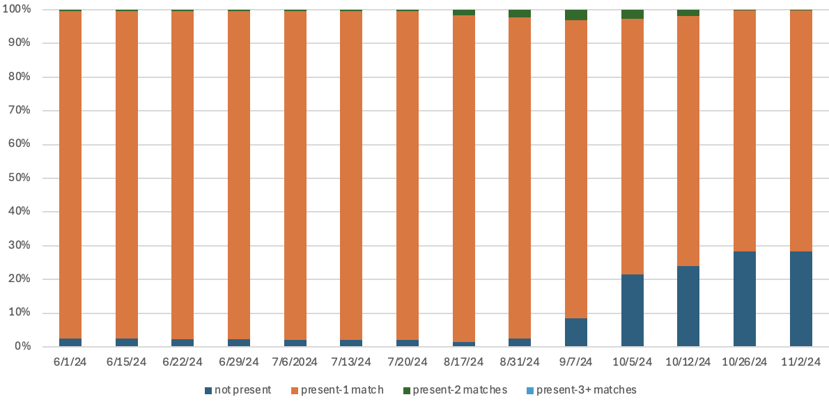 Figure 8. Distribution of registrations associated with DroppedSubjects by name and full date of birth over time in 2024. (a) Numerical breakdown and (b) graphical representation of the occurrences of registrations with the same name and month, day, and year of birth as DroppedSubjects in data snapshots between June 1 and November 2, 2024. For each observation, registrations are categorized as: “not present” for those not found in the Voter Data; “1 match” for registrations with exactly one record matching the name and date of birth; “2 matches” for cases with two matching records; and “3+ matches” for instances where more than two registrations appeared for the same name and date of birth.