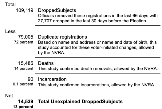 DroppedSubjects. The “DroppedSubjects” in this study are the 109,117 voters whose registrations were removed from Voter Data during the Last 66 Days.