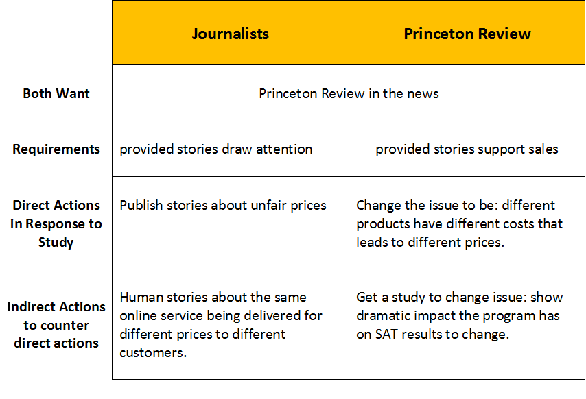 Journalists primarily want to write attention-grabbing stories, so the study would likely garner some media attention. The Princeton Review wants journalists to write stories about its services, but it wants those stories to support sales.