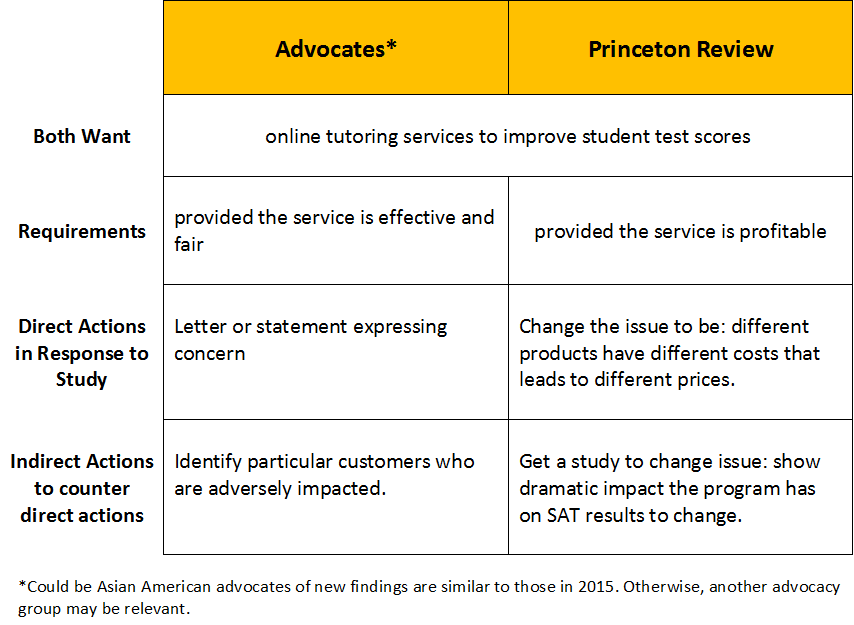 The media attention spawned from the study could also motivate action from consumer groups involved, especially if like the 2015 study, one racial group is likely to have to pay the higher price significantly more often that other groups. An advocacy group may write a letter or issue a statement of concern, to which the Princeton Review would likely respond in the manners described earlier. (See Appendix B.)