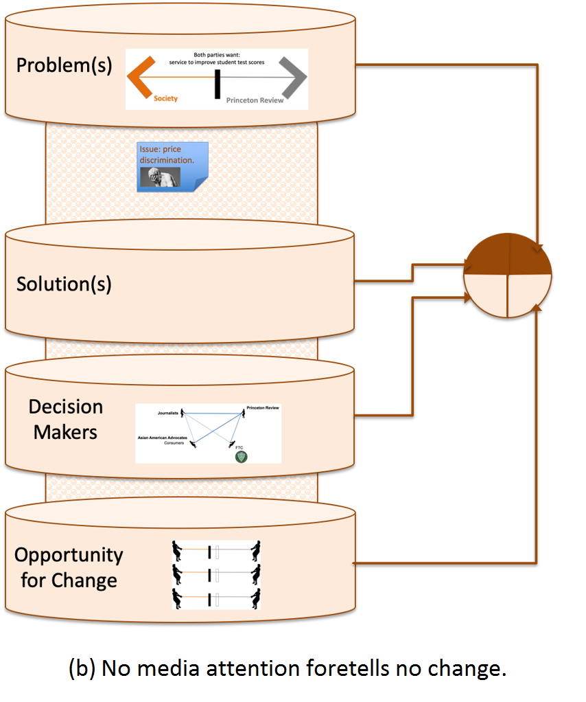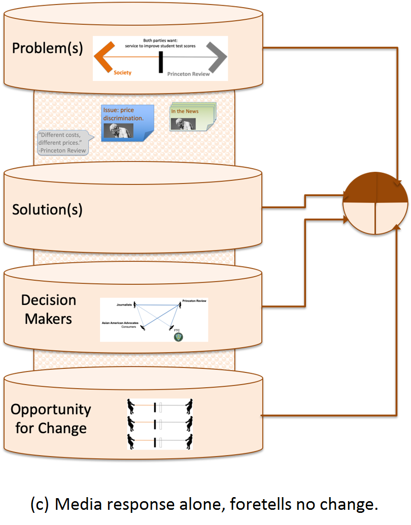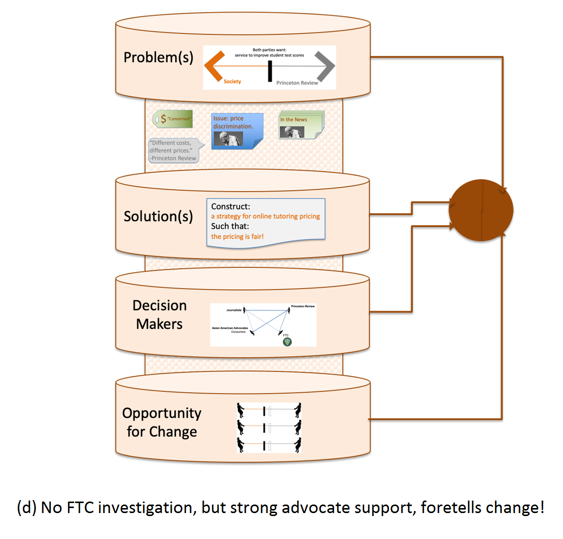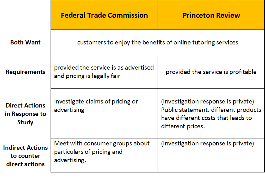Eventually, the media attention, advocacy group concern and FTC investigation would likely lead to the Princeton Review changing its pricing practice (Appendix D). Media attention alone may not lead to a change in the practice at Princeton Review if the company is good at getting the public to falsely believe that the study is just reporting on the fact that the Princeton Review charges different prices, but the study failed to understand that the different prices result from in-person tutoring costs being different geographically. If the FTC does not launch an investigation but advocates express public concern, then the Princeton Review would still be likely to change its practice. If the media fails to pay attention to the study, however, the advocates and the FTC are unlikely to learn about the issue, so no change would be expected by the Princeton Review in its practice.