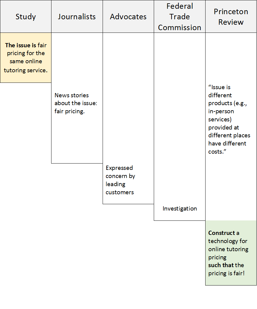 In summary, a study (Study 1 or Study 2) that showed geographical or racial bias in prices for the same service at the Princeton Review website could first lead to media attention, to which the Princeton Review might respond with statements that confuse the issue. For example, the study might show prices differ for the same online tutoring service –i.e., the costs are the same regardless of the geolocation of the student, but the price offered by Princeton Review varied. Princeton Review offers many different services, including some that are in-person tutoring services. The costs for in-person tutoring differs, and so understandably might the price. Princeton Review might make public statements that confuses what the study shows.