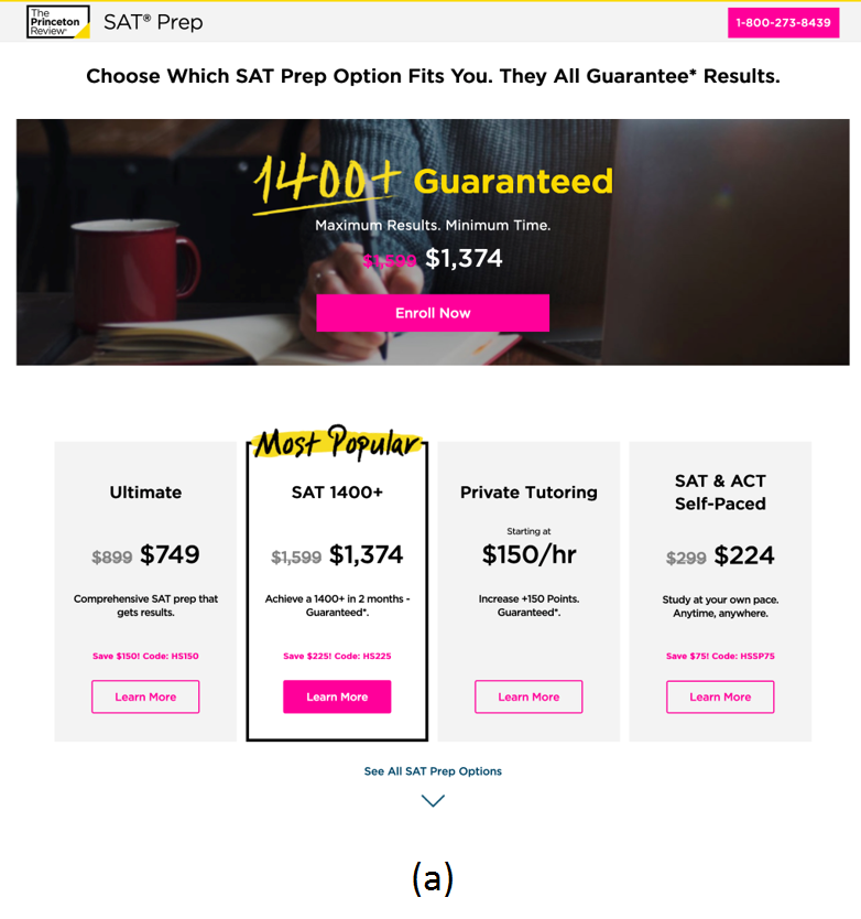 Princeton Review also offers in-person tutoring services with a “guarantee” of achieving a minimal SAT score (Figure 1a and 1b). The labor, travel and office costs for in-person tutoring may understandably vary geographically. A study might examine the conditions for the guarantee to see whether they appear fair to consumers. A variant my examines the socio-geographical availability of these services and their price by writing a computer program that visits the Princeton Review website from different IP addresses around the country and recording reported availability and price of guaranteed services and then compare the reported prices to the relative living costs for those areas. Another variant of this study might systematically compare harvested prices and availability to educational disparities. (Note: This is a related study, so many of the motivations and predicted events described elsewhere in this writing do not apply.)