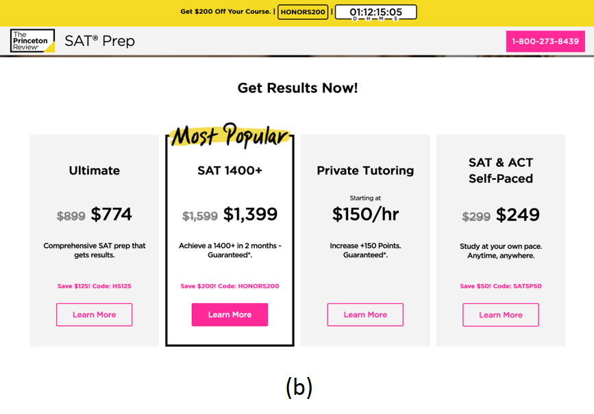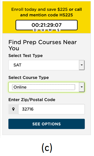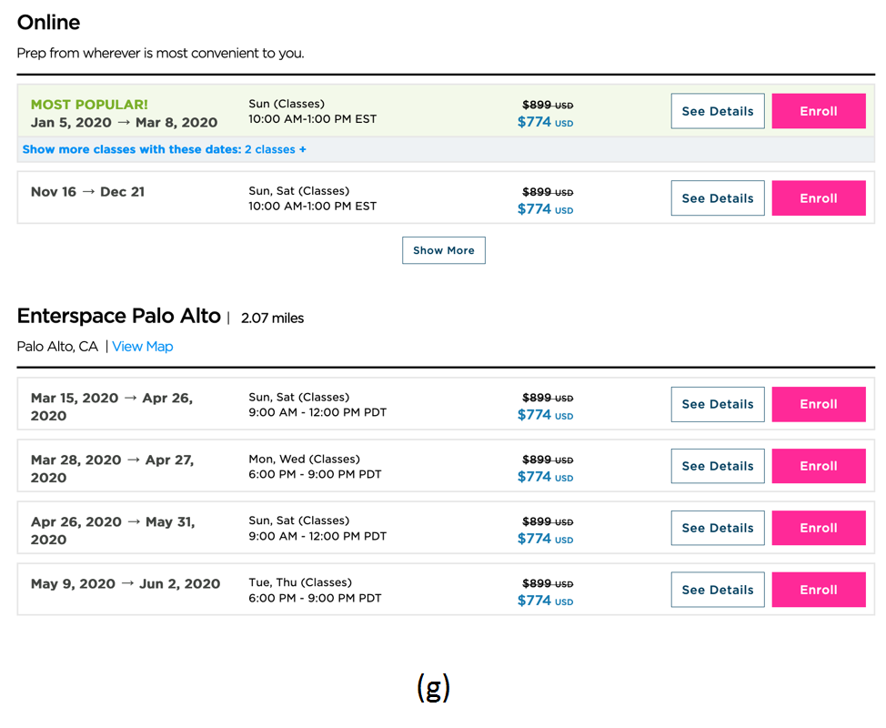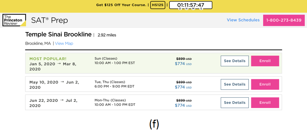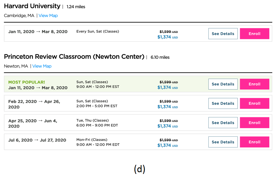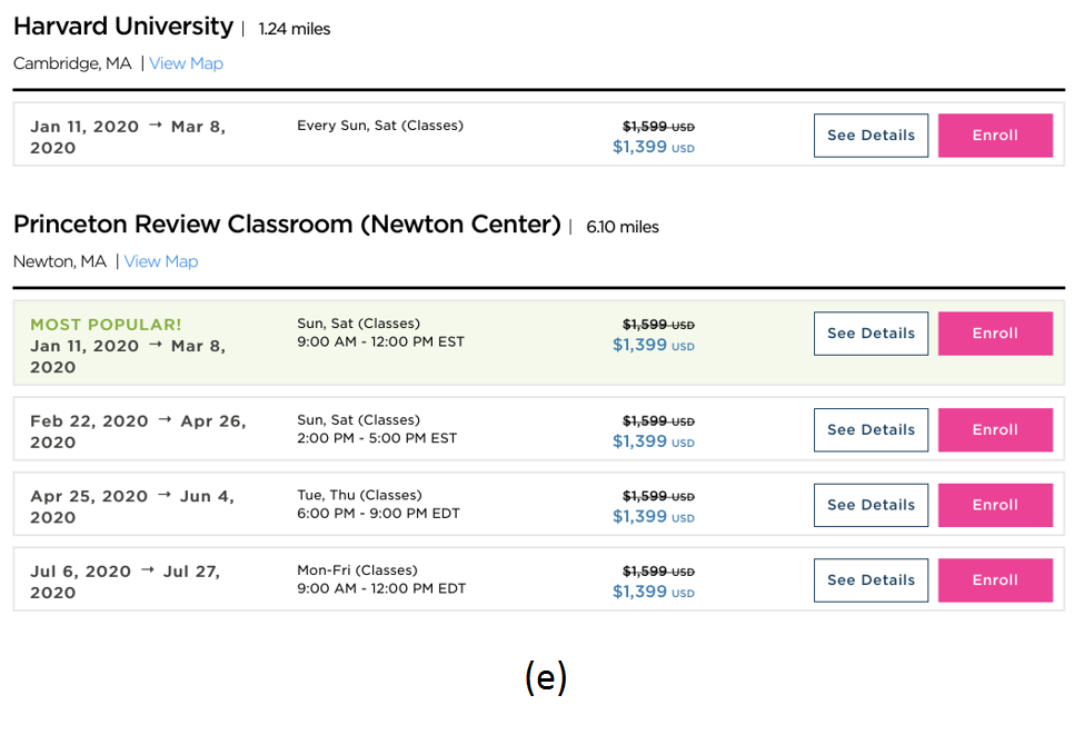 Advertisements on the Princeton Review’s website in November 2019, four years after the previous study, shows a price immediately upon loading the page for an in-person tutoring service (Figure 1a). Navigating around the website reveals an option for an online tutoring service that requires the entry of a ZIP code before showing its price (Figure 1c), and references are made to guaranteeing an SAT outcome (Figure 1a). Whether the same price for the same online service appears automatically or differs based on the IP address of the machine visiting the site is not clear. Figure 1 shows different prices shown to the same machine using different IP addresses, one in Massachusetts (Figure 1a, 1c, 1d, 1e and 1f) and one in California (Figure 1b and 1g).